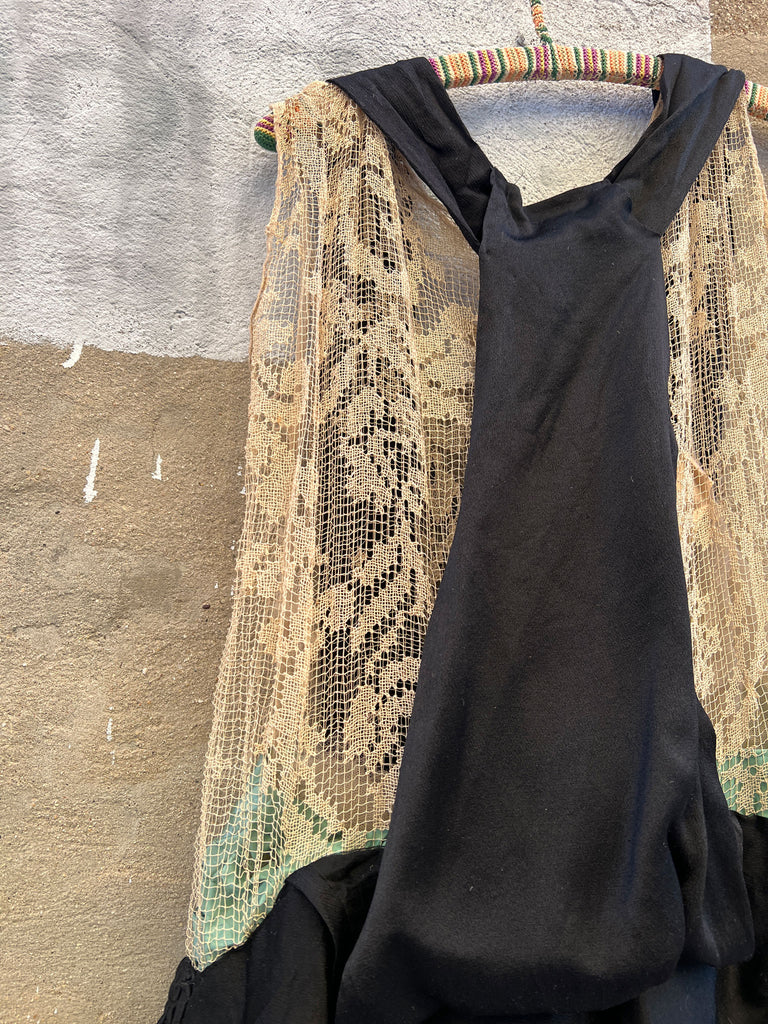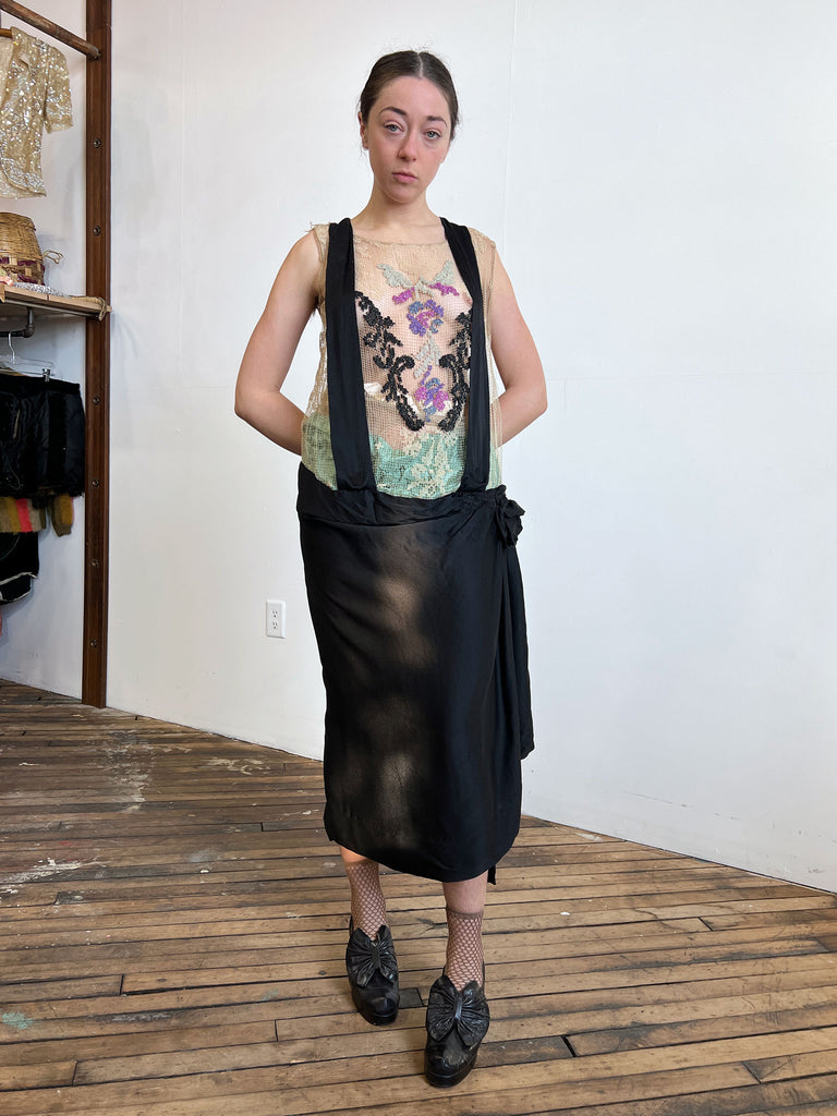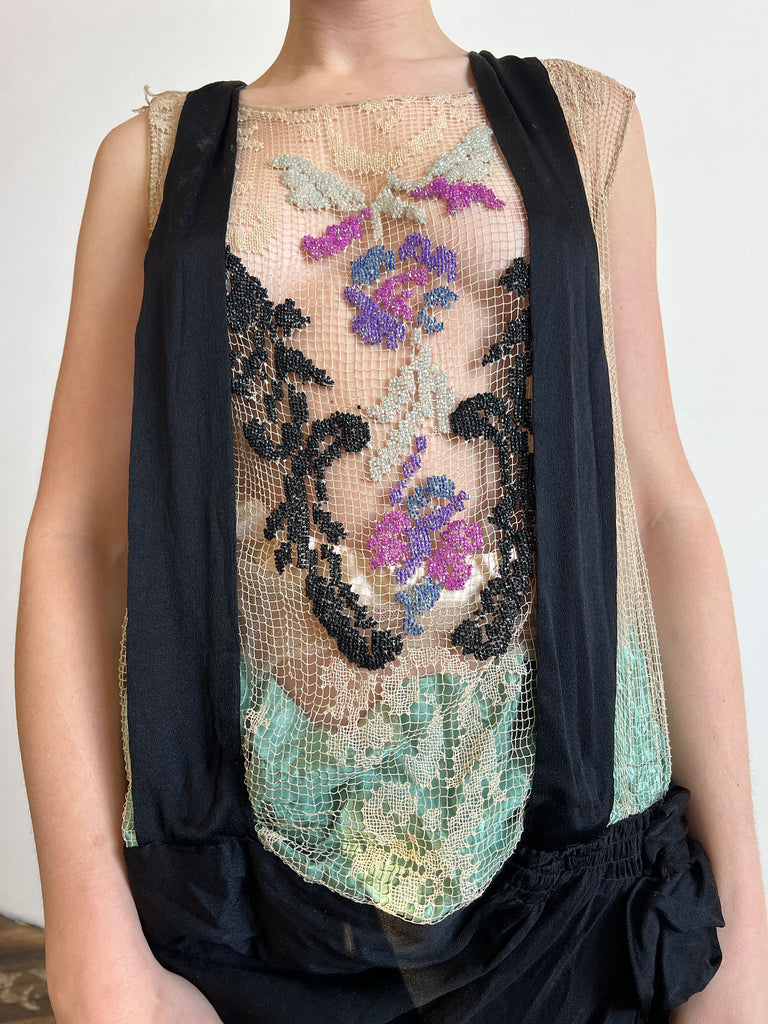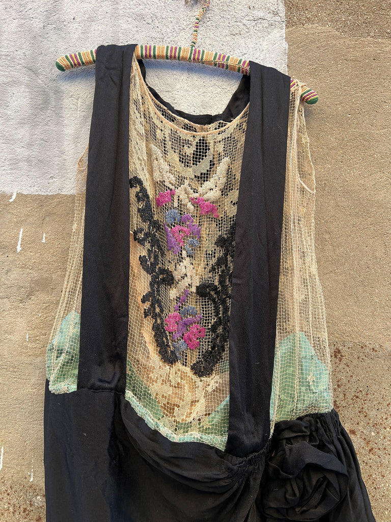 Antique 1920's Silk Dress with Floral Beadwork and Netting