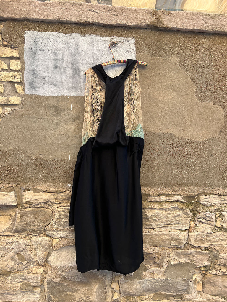 Beautiful antique 1920's era silk dress with wild risqué netting and glass beadwork flowers