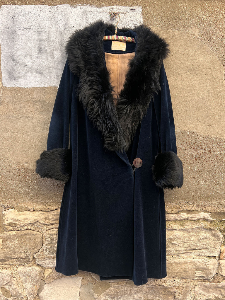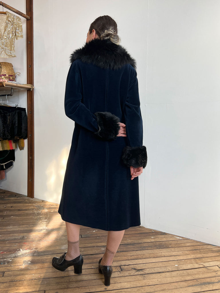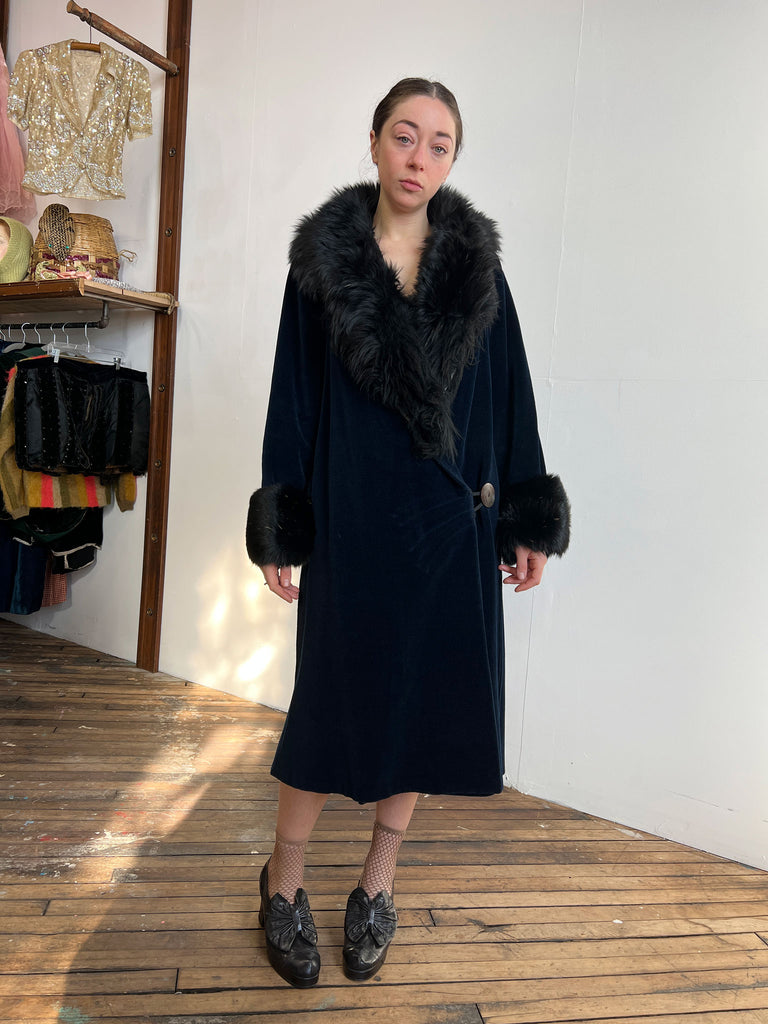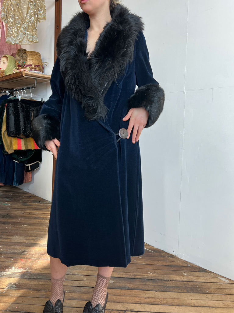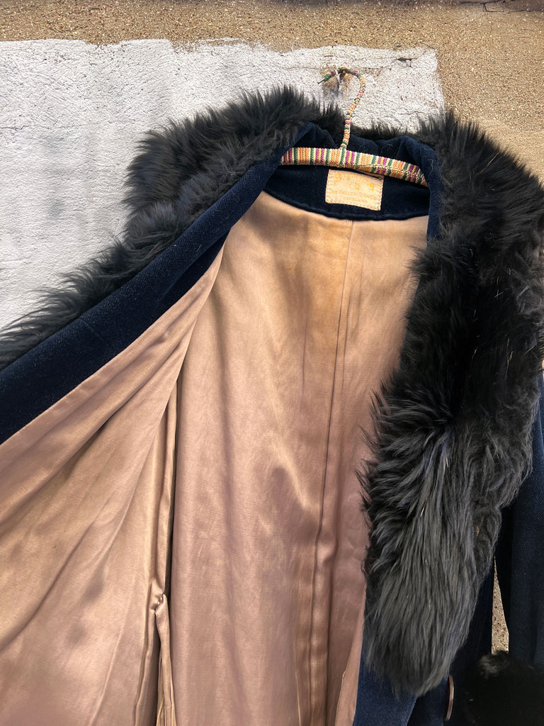 Very cool antique 1920's flapper coat with navy blue wool and black fur collar and cuffs
