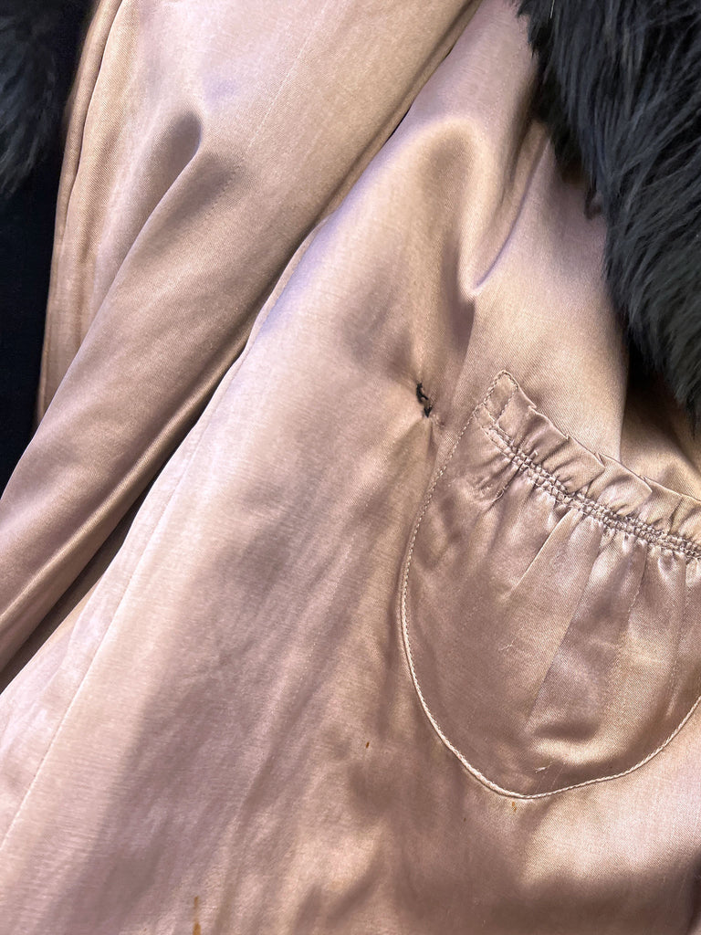 Condition: Some balding in places to fur, missing inside of coat button, some staining to satin lining as well. Very strong and wearable.