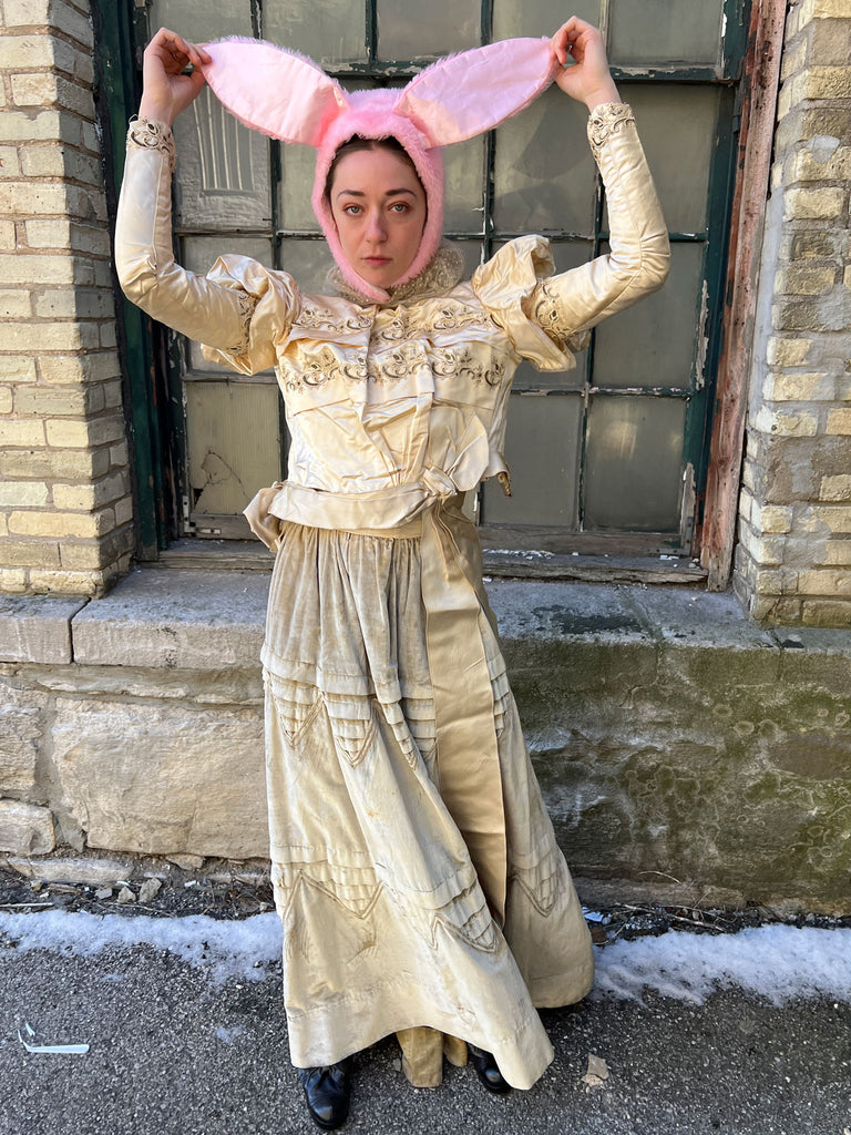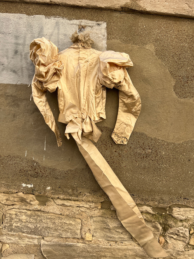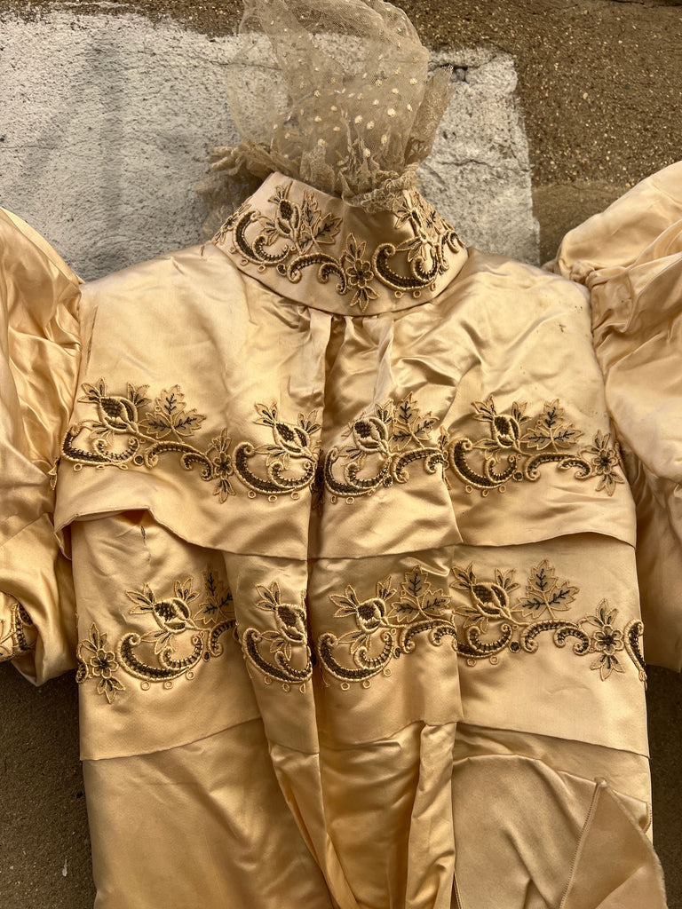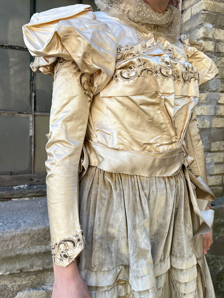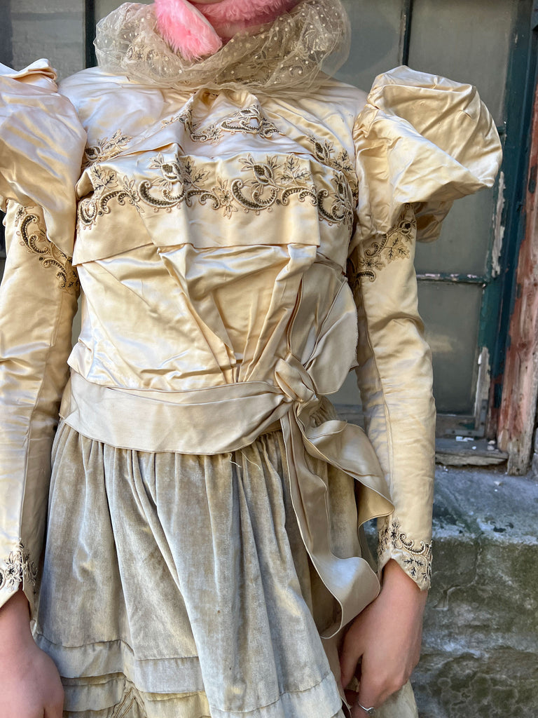 Condition: I'm selling this as is, as found. There is some wear/ripping to bodice silk in areas - shown in photographs. It may be wearable with care but it is fragile. Pricing it low for these reasons.