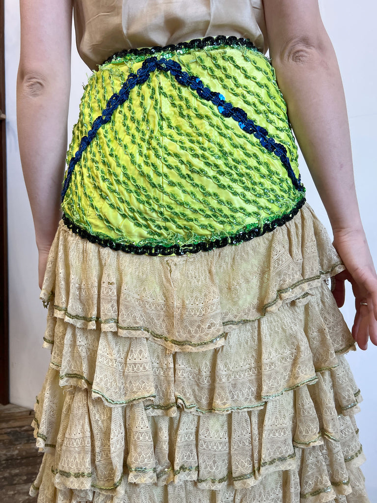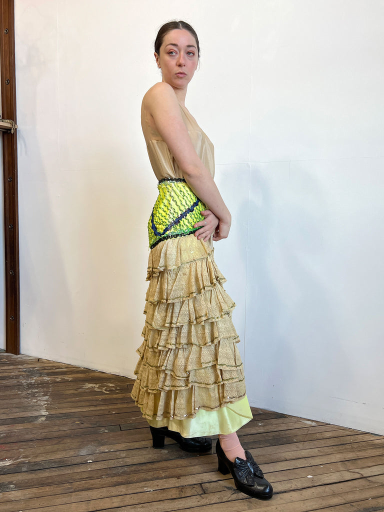 Ruffled down the front with hook and eyes around the neon green banding at waist